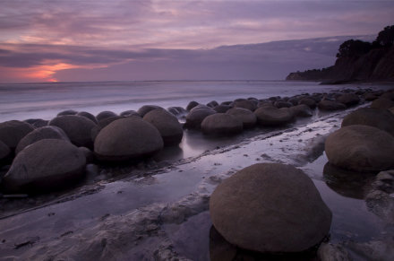 Steinkugeln, die in der Brandung liegen und je nach Wasserstand mehr oder weniger von den Wellen umspült werden. Als