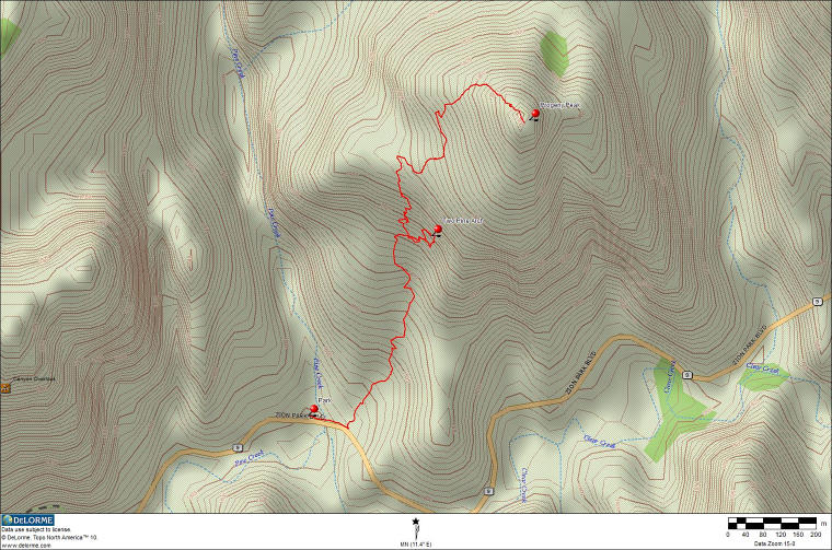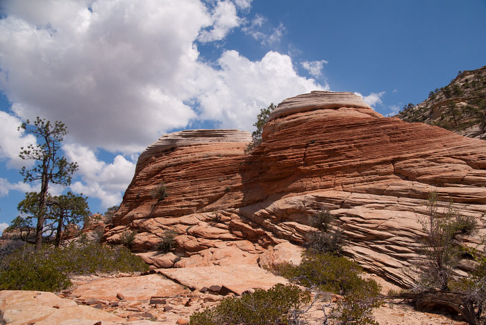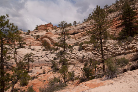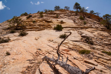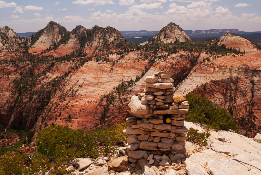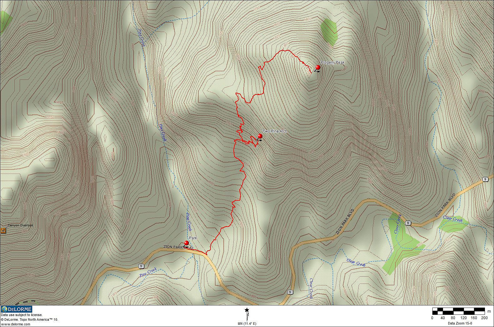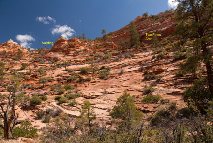 Ich war auf der Suche nach interessanten Touren im Zion NP, als ich auf der Webseite von Joe Braun eine Beschreibung für den Aufstieg auf den Progeny Peak fand. Es klang anspruchsvoll und versprach einen guten Rundum-Blick im östlichen Teil des Parks, wo man sonst nur die Froschperspektive von der Straße aus kennt. Es gibt zwei kleine Parkbuchten an der Straße, wo man sein Auto abstellen kann. Von der oberen steigt man in westlicher Richtung die Böschung hinauf und gelangt bald in einen felsigen Wash, den man weiter folgt. Wo es dann flacher wird, hat man schon einen guten auf den weiteren Slickrock-Aufstieg.Zuerst kann man einen Abstecher zur Two Pines Arch machen. Von dort quert man dann ein Stück zurück und steigt über steilen Slickrock zwischen den zwei hoodooähnlichen Nebengipfeln nach oben. Der Beginn dieses Aufstiegs ist ziemlich steil und erfordert etwas klettertechnisches Feingefühl. Danach wird es flacher und man kommt zu einem markanten Doppel-Hoodoo. Dahinter geht man weiter in einem großen Linksbogen und nähert sich der nächsten Steilstufe aus hellem Slickrock. Danach hält man sich rechts und steuert auf den Gipfel zu.Nun erreicht man den letzten Anstieg zum Gipfel. Der Slickrock ist ziemlich steil. Ich hatte mir einen Weg durch das Geröll gesucht, da es den Eindruck von gestuftem Gelände vermittelt. Das war allerdings trügerisch, denn es rutsche manchmal abwärts unter der Last meines Körpers. Vielleicht gibt es auch andere Wegführungen, die über Slickrock gehen und das lose Geröll vermeiden. Hier kann sich jeder seinen Weg selbst suchen.Am Gipfel wird man durch einen fantastischen Ausblick für den abenteuerlichen Aufstieg belohnt. Im Steinmännchen auf dem Gipfel gibt es ein Plastikrohr mit einem Gipfelbuch, wo man sich eintragen kann. Fazit: Ein lohnenswerter Gipfel mit tollem Rundumblick. Man muss allerdings fit sein für die wenigen Klettereinlagen und schwindelfrei, um die steilen Slickrockanstiege zu meistern. Es ist nichts für Anfänger.