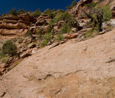 man eine steile Slickrock-Platte queren, die talseitig abschüssig ist und in